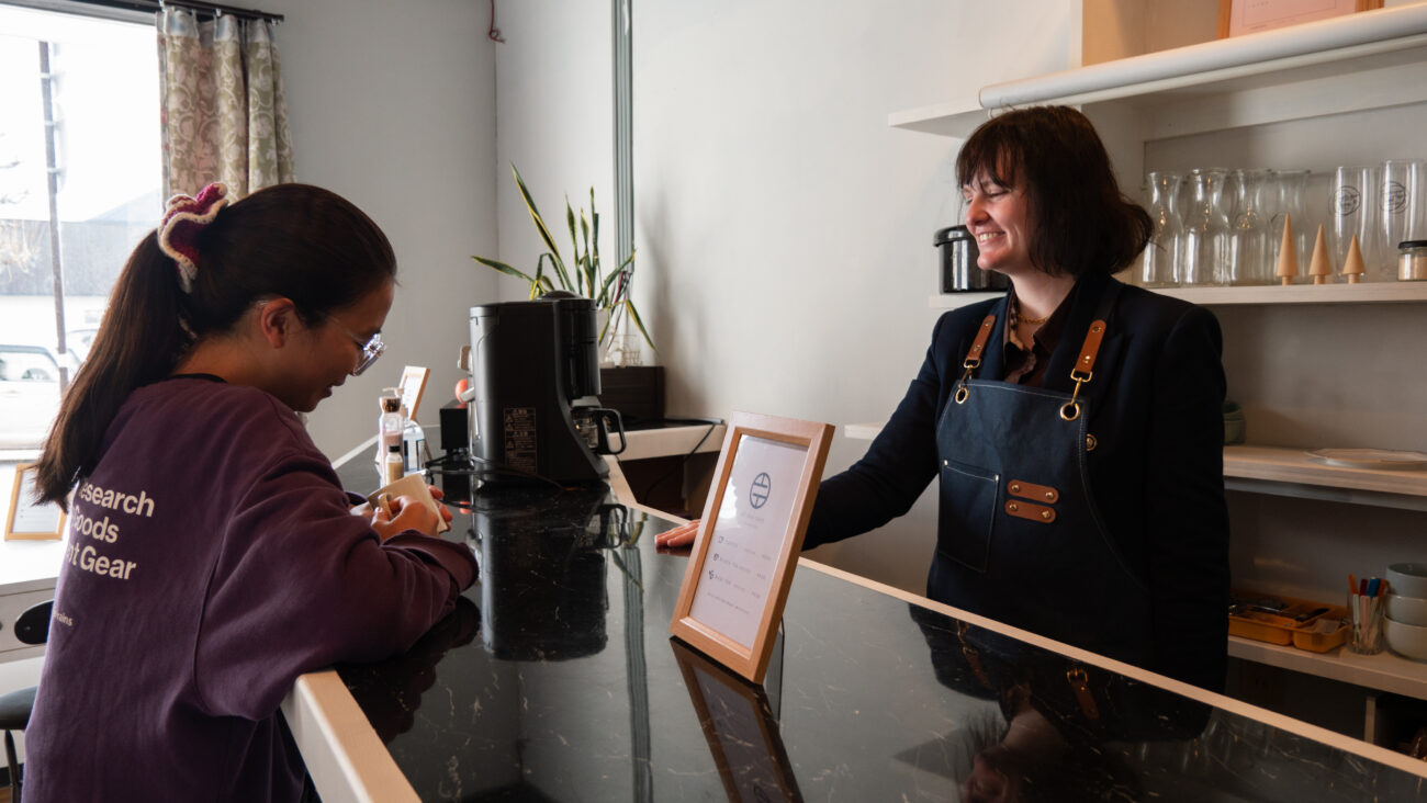 QT Cha Cafeはコーヒーや紅茶、日替わりの茶菓子、焼き鳥などが楽しめるシンプルな小さなカフェです。飲み物を味わいながらほっと一息ついたり、スタッフに日々の愚痴をこぼしたり、そんなささやかな時間を提供します。